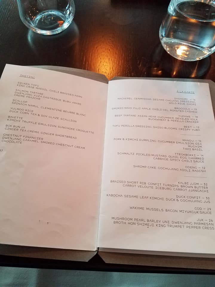 Chicago Avenue in Westtown has a wealth of restaurants and even if a favorite restaurant leaves, it is soon replaced by another restaurant equal or greater than that that has gone away. I was very said when vegetarian fine dining restaurant, Green Zebra, closed. I became very excited, though, when I found that the people behind Hanbun, which was essentially a Suburban Food Court stall serving amazing Korean food would be coming into Chicago and replacing Green Zebra in their space. The new place is called Jeong and while the color of the space has changed, Green Zebra was done in greens and Jeong is done in grays and browns, the layout is very similar. The windows are also different. The door is on one side and to enter the dining room you walk down a passageway with the glass outer wall on one side and a half wall overlooking the dining room. We were seated on the side opposite the entryway under a cut in where a stairway is on the other side of the wall. The menu looked really good. They have both a Tasting and an a la Carte menu. While there were several things on the a la Carte menu that looked good, we decided to go with the Tasting Menu. Before that came our cocktails and wine. They had what looked like a pretty good wine list, but I decided to go with a cocktail. The cocktails were all named after key ingredients in Korean cooking. I got a Gochujang which was a red, gin-based cocktail with, according to the listed ingredients, Junipero Gin, Calamansi Lime, and St. George Raspberry Liqueur. I also wondered if it also contained Gochijang, because while it had a sweet, tart, and citrusy flavors, as would be expected, it also had a finish that was pretty spicy. I like spice, but it was a surprise, but the drink was pretty good, despite the surprise.